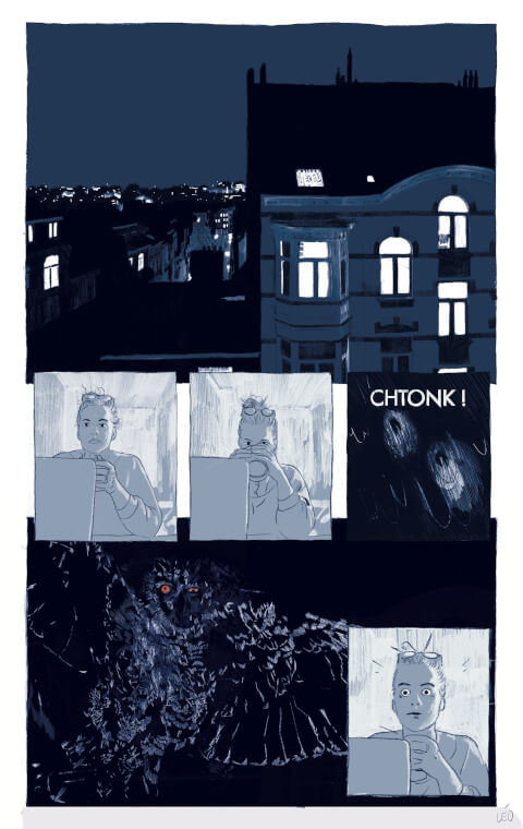 Avifaune, projet de recherche et de bande dessinée en cours. "Désorienté, un soir, en pleine ville, un Grand-duc se heurte à votre fenêtre. Suite à sa chute libre sur cinq étages, vous le retrouvez, mal en point, en bas, sur le trottoir. Que faire ? Novice sur l'avifaune qui vous entoure, vous plongez dans la découverte d'un réseau d'observateurs, de défenseurs et de protecteurs de la vie des oiseaux en ville".