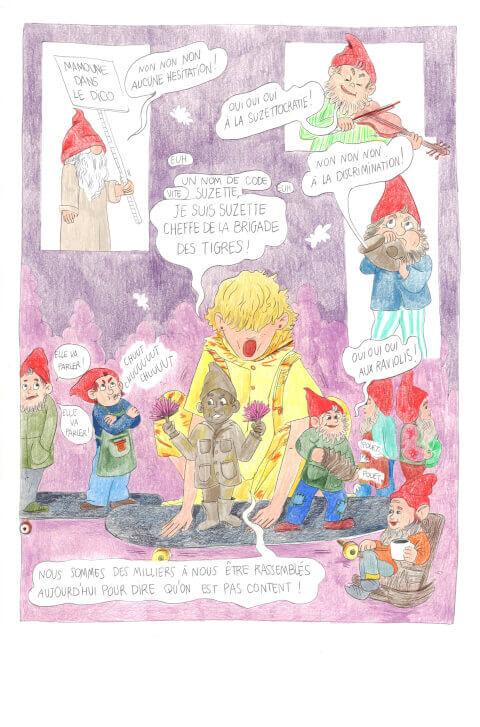 Suzette Project, une bande dessinée en cours de création. Collaboration avec Laurane Pardoen. "Suzanne, fan d’Al Pacino et des tigres de savanes, a une maman et une mamoune. Suzanne a aussi une best friend forever, Alice, dont les parents sont divorcés. Dans la cour de récré, elles partagent leurs rêves d’aventures et font des plans sur la comète. Dans la cour de récré, il y a aussi un nouveau, Maxence, poète maladroit, qui se donne des airs mais qui n’a pas l’air du tout.Tout bascule le jour où on déchire en mille morceaux le poème que Suzanne avait écrit pour ses deux mamans. Une grande cyber-enquête commence. Suzanne rencontre d’autres enfants et d’autres récits, milles et une manières de faire famille… et de vivre ensemble ! La révolution du gang de tigres est en marche ! Bingo !" Une BD pour toustes, qui interroge la vision de la famille et de ses différents modèles. Des interviews documentaires se mêlent à la fiction afin de découvrir, à travers un gang de mômes rugissants, les méandres de la diversité, l’ouverture à la tolérance, la naissance de la résistance. Adaptée du spectacle Suzette Project de Laurane Pardoen de la DADDY Compagnie, prix SACD Théâtre Jeune Public 2019. Suzette Project est une bande dessinée à destination d’un public jeunesse.